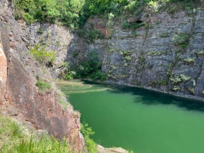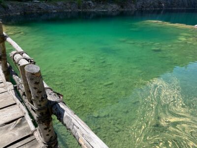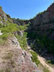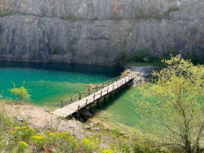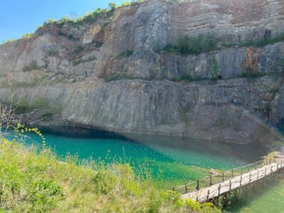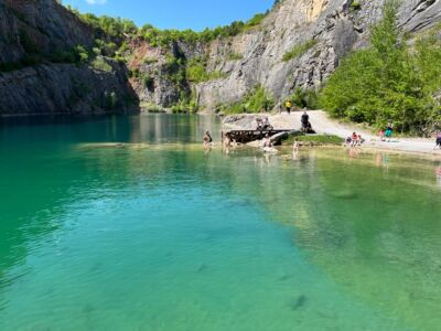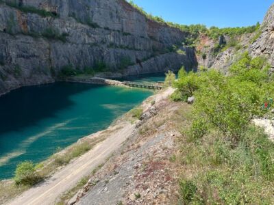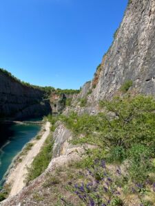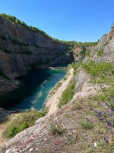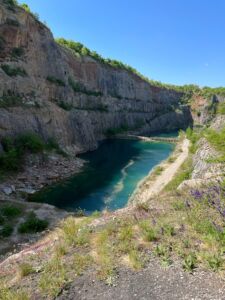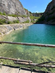 Poránu jsme se ladili v motorovém voze na naši „náročnou“ akci. Společně s hosty jsme se po příjezdu na vlečku Lomy Mořina vydali turistickou stezkou na dno lomu Velká Amerika. Přes těžkotonážní, pro běžnou veřejnost zcela zavřená, vrata. Víte, ona je ta Amerika svrchu krásná, ale vidět český Grand Canyon z jiného úhlu, to nadchlo opravdu každého. Měli jsme mezi sebou odvážlivce, jež teplotu čiré vody vyzkoušeli.