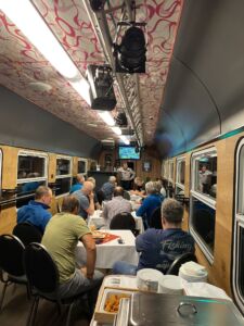 Účastníci absolvovali cestou ve vlaku přednášky věnující se aktuálním tématům železnice a s prezentujícími vřele diskutovali o možnostech nákladní dopravy, bezpečnosti na železnici a vytížení železnice jako takové.