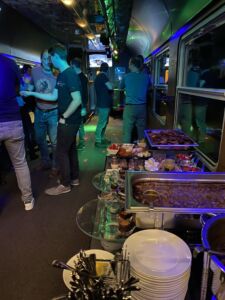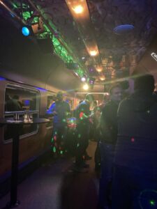 Při zpáteční cestě party pokračovala v plném proudu a všichni se skvěle bavili. Samozřejmě jsme naše cestující nenechali strádat, k dispozici jim po celou cestu bylo pestré občerstvení, na baru jim usměvavá obsluha plnila skleničky. Nechyběla ani hudba na přání a záře profesionálních reflektorů. Celá akce se opět vydařila a my se těšíme na další setkání!