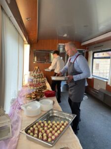 Pozadu nezůstala ani majitelka společnosti. Tato velice charismatická dáma oblékla tematický úbor státní železniční organizace, aby pečlivě zkontrolovala jízdenky přítomných.
